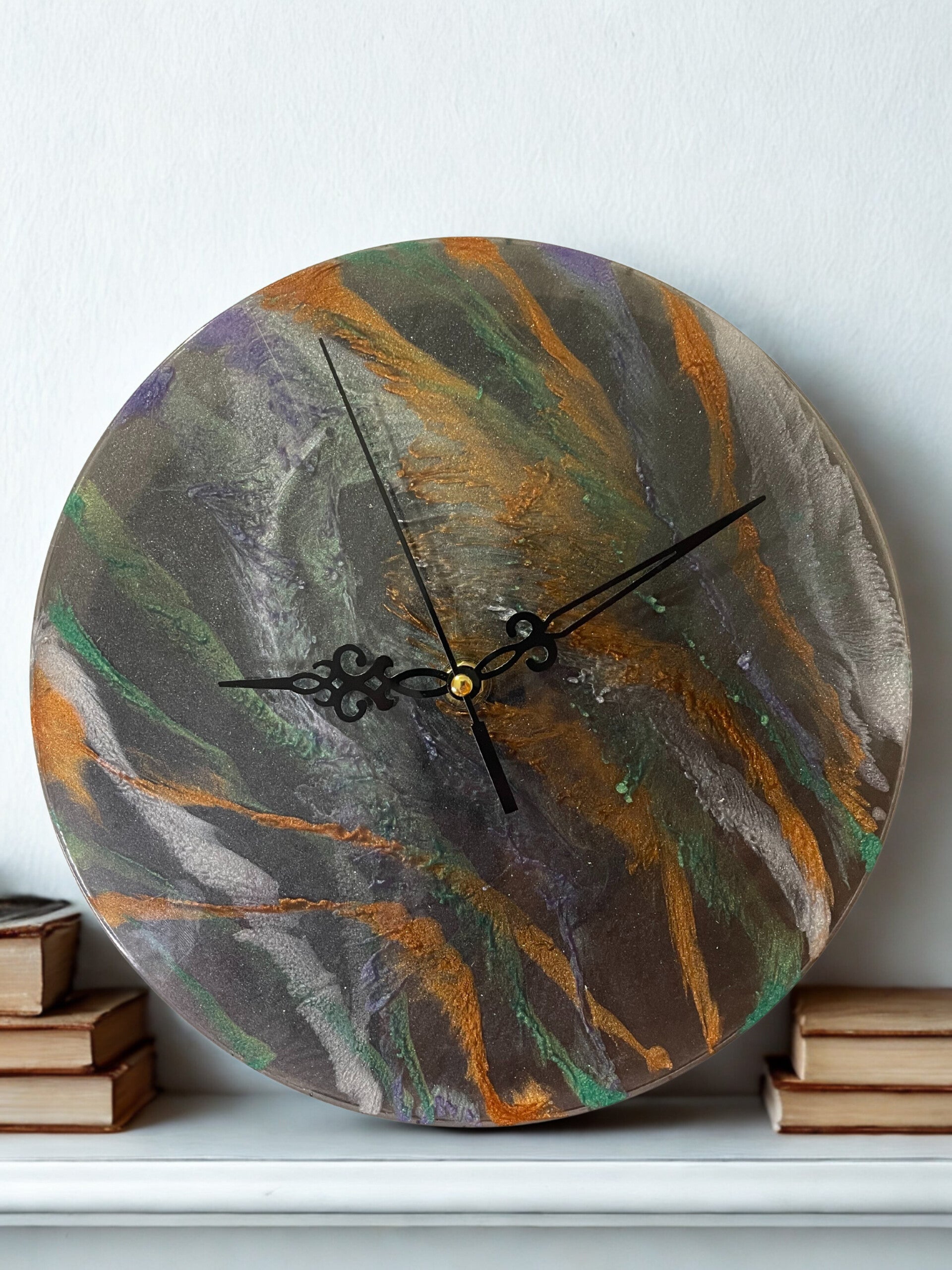 This clock is approx 10 inches/25 cm's, has silent mechanisms, it has a black background with swirls of green, copper and splashes of purple.